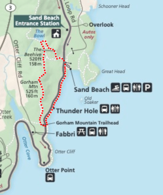 One of the most trafficked trails in Acadia, the Beehive Trail challenges hikers to ascend a 450-foot cliff using little more than narrow granite ledges and iron rung ladders. Hikers who reach the summit are rewarded with beautiful views of Sand Beach, Gorham Mountain, Thunder Hole, and the Gulf of Maine. The quickest loop to the top is 1.4 miles, but I recommend extending it using the Gorham Mountain Trail and the Ocean Path (see the dotted red line on the map).